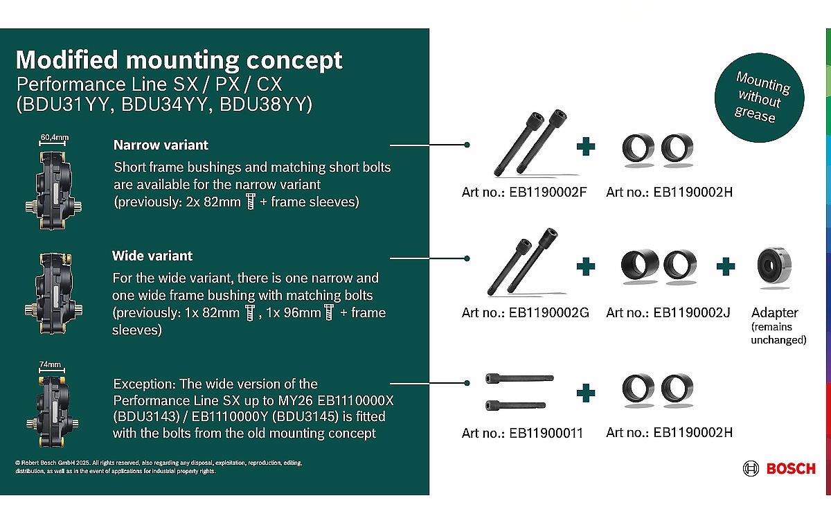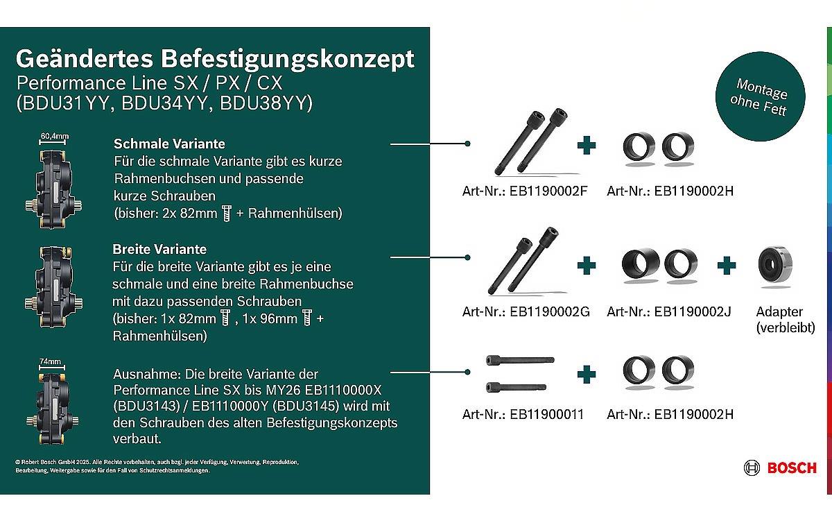 Die bisherigen Rahmenhülsen werden durch Rahmenbuchsen ersetzt. Die Rahmenbuchsen und die dazugehörigen Schrauben sind rückwärtskompatibel zu den Drive Units, die noch mit Rahmenhülsen verbaut wurden. Der Adapter bleibt unverändert.