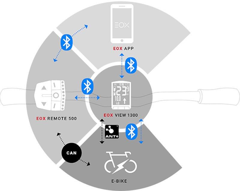 Der EOX® VIEW 1300 ist kabellos und lässt sich wie ein regulärer Fahrradcomputer ganz einfach mit einem Klick auf die Lenkerhalterung drehen. Anschließend koppelt er sich via BLE oder ANT+ LEV innerhalb kürzester Zeit mit den meisten gängigen E-Bike Systemen.